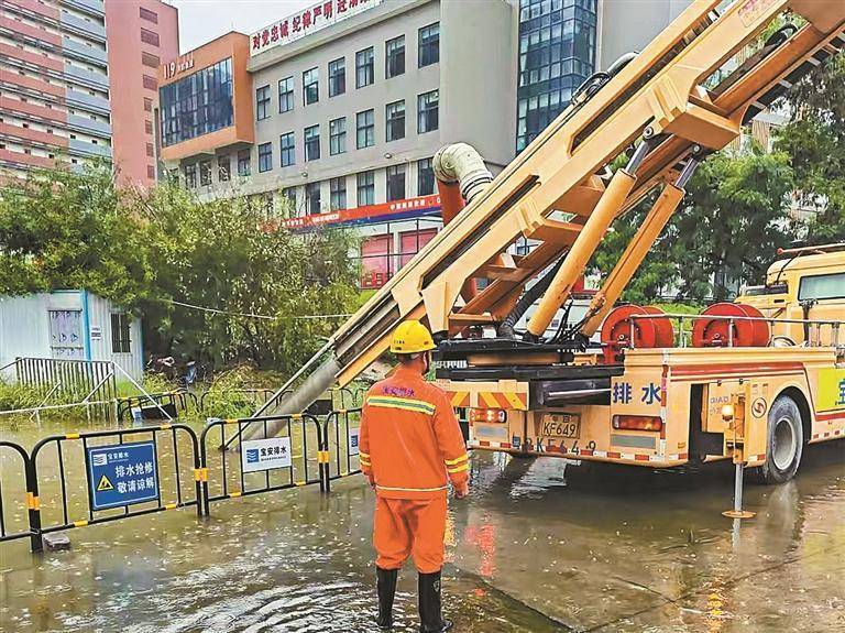 宝排沙井分公司员工在海上田园消防救援站附近抽排积水。深圳特区报记者 毕晗 摄