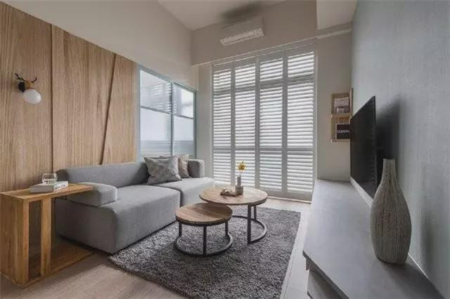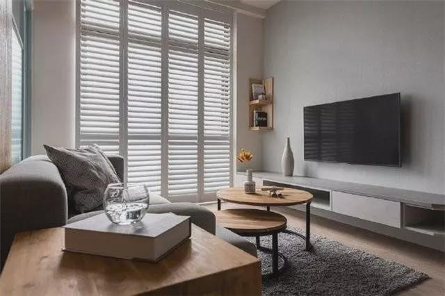 客厅不足3.4米的开间,被安排得井然有序。落地百叶窗,透过来的充足光线,让客厅够明亮,但不会太晒。电视背景墙选择灰色墙面搭配原木色置物架,联排式电视柜,设计可爱。