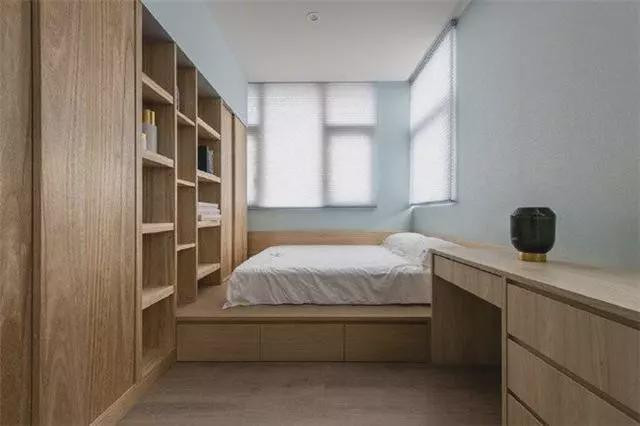 卧室用定制榻榻米搭配书桌的设计,不需要太大,但足够温馨。床底位置的一整面柜子,既可以做衣柜,还可以作为书架使用,一物多用。