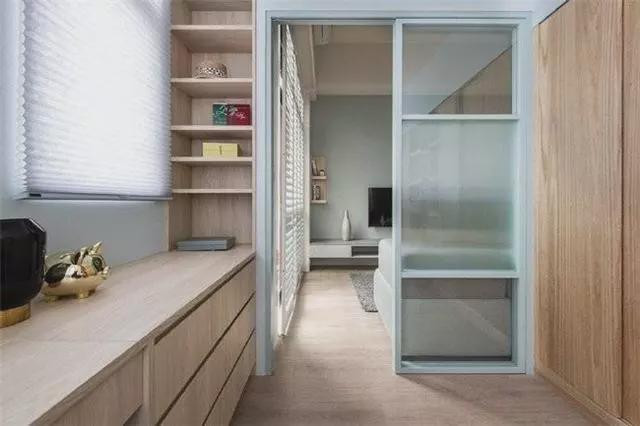 客厅和卧室之间,用一扇透明的玻璃门做分隔,不会阻挡光线,但也足够私密。
